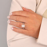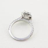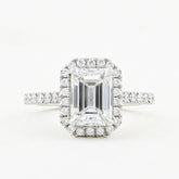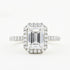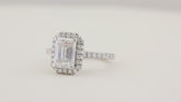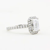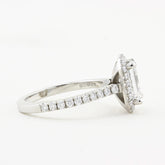 An eye-catching pre-owned Diamond engagement ring, featuring a 1.51ct Emerald Cut Diamond centre stone surround by a halo of further brilliant cut Diamonds with Diamond set shoulders giving an estimated total diamond carat weight of 2.11ct, crafted in Platinum,