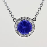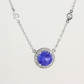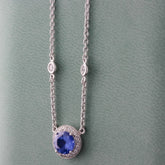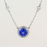 18ct White Gold necklet features a 1.44ct Blue Sapphire pendant in a claw setting, surrounded by a halo of brilliant cut Diamonds in a grain setting and two further Diamonds spectacle set interspersed into the chain, bringing the total Diamond weight to 0.26ct.