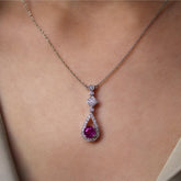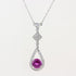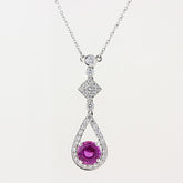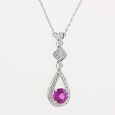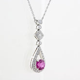 18ct White Gold necklet features a 1.13ct vivid pink Sapphire in a claw setting, suspended from a Diamond set design, articulated for movement. The total Diamond weight is 0.33ct, with the Diamonds graded H in colour, VS in clarity.
