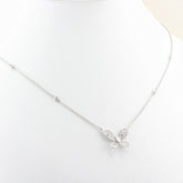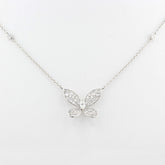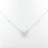 Pre-owned butterfly design necklace with a marquise cut Diamond body and Diamond set wings, crafted in 18ct white gold. The feature section is suspended from a trace chain, set with four spectacle set Diamonds interspersed along the chain.