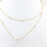 This elegant long chain features alternating beadless saltwater cultured pearls and round brilliant cut Diamonds of varying carat weights giving a total Diamond carat weight of 1.02ct, each set in a bezel setting.