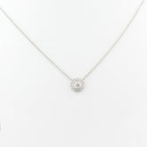 This Tiffany necklace features a central round brilliant diamond measuring approximately 0.16ct, surrounded by two haloes of additional diamonds giving an approximate total diamond carat weight of 0.30ct. Diamonds are F-G in colour and VS clarity.