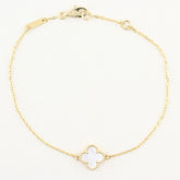 This bracelet features the iconic clover design with a mother of pearl inlay on a delicate chain measuring approximately 17cm in length. Complete with a lobster clasp fastening which can be worn at two lengths.
