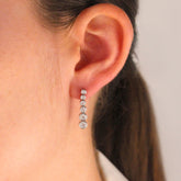 Each earring features six brilliant cut round graduating Diamonds giving a total carat weight of approximately 1.00ct and are a 2cm drop. The Diamonds are F-G in colour with VS1-VS2 in clarity and are bezel set in platinum.