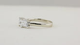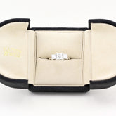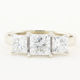 A pre-owned three stone Princess cut diamond engagement ring set in 18ct white gold.
