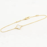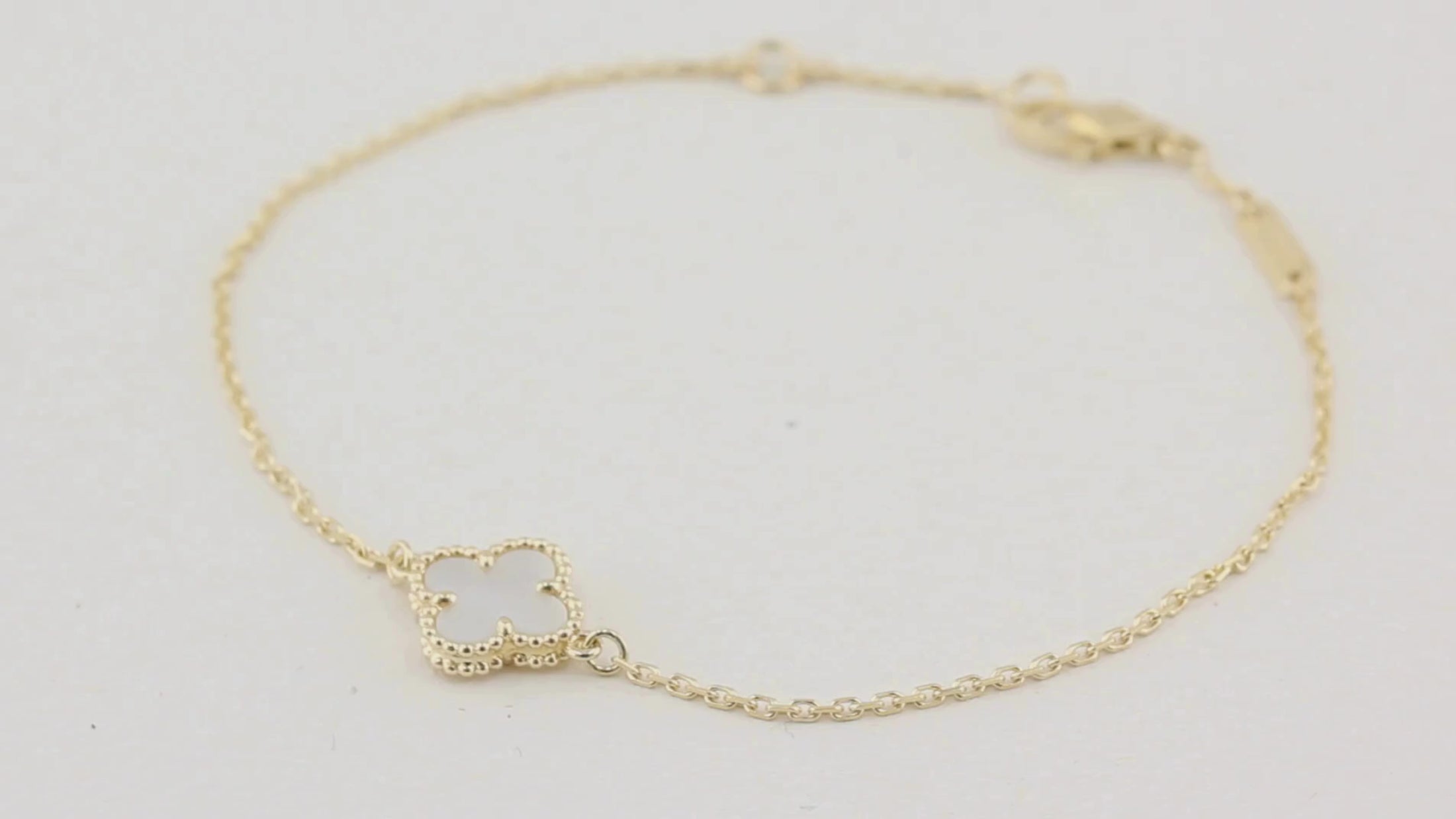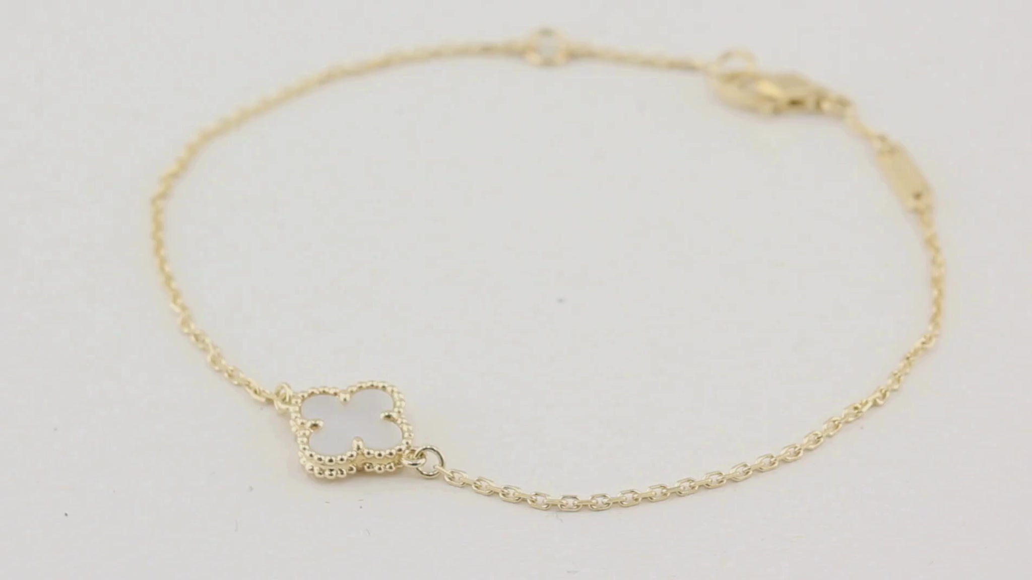 This bracelet features the iconic clover design with a mother of pearl inlay on a delicate chain measuring approximately 17cm in length. Complete with a lobster clasp fastening which can be worn at two lengths.