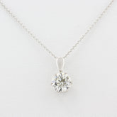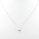 This necklace features a 0.78ct round brilliant cut diamond, H in colour, VS1 clarity in a six claw setting with an 18ct white gold bail, suspended on a delicate 9ct white gold chain.