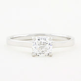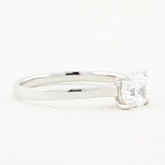 A classic solitaire engagement ring featuring a 1.01ct cushion cut diamond in a four claw setting, set in platinum.