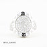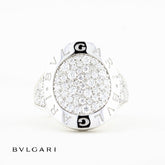 A Bulgari Diamond disk ring, from the 'Curvo Revanting' collection. The ring has a curved disk design, grain setting with round brilliant cut Diamonds and the iconic Bulgari logo to the circumference the disk. The shoulders of the ring are tapering in shape, set with further Diamonds.