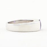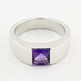 The ring features a square cabochon top Amethyst to the centre, flush set into a heavy-weight 5.50mm wide band.