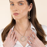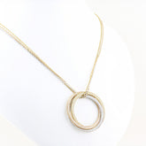 Each circle has an inner circumference of 34mm. The pendant is suspended from a triple chain, comprised of 18ct yellow gold, 18ct rose gold and 18ct white gold chains, each measuring 1.4mm in width and 55cm in length.