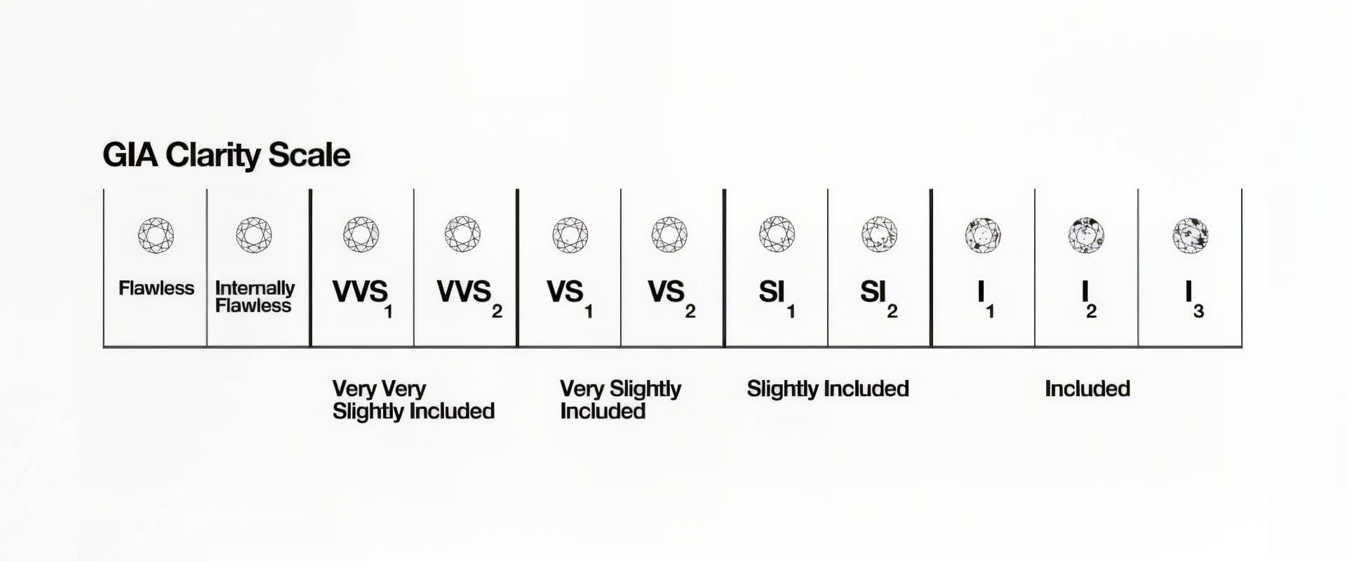 Clarity is graded on a GIA scale from Flawless (FL) to Included (I3), based on size, type, location, and visibility of inclusions under 10x magnification.